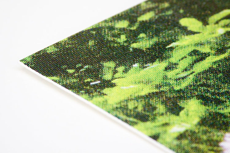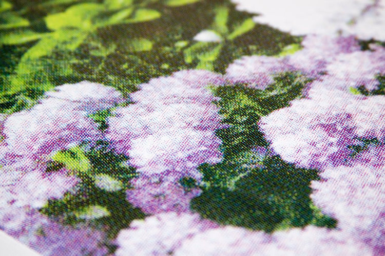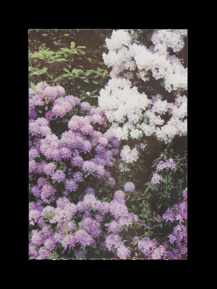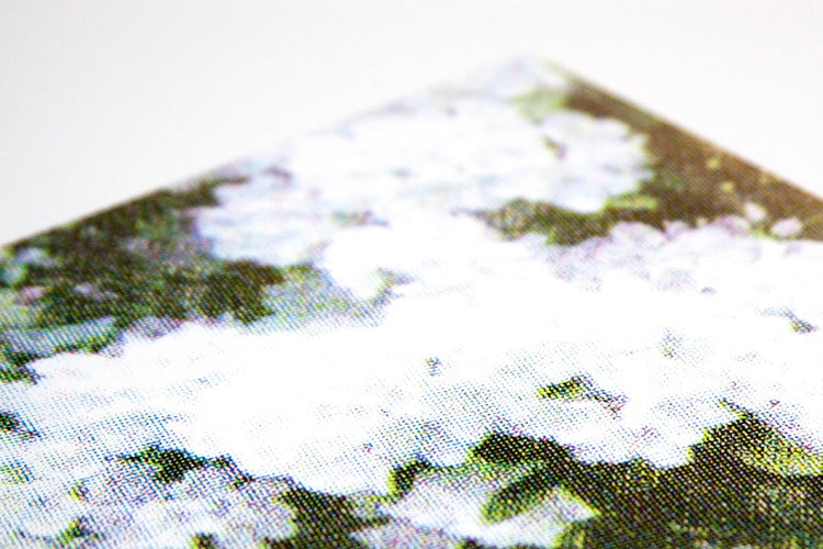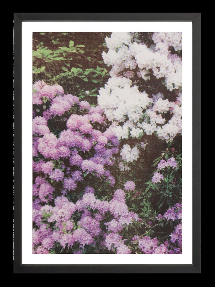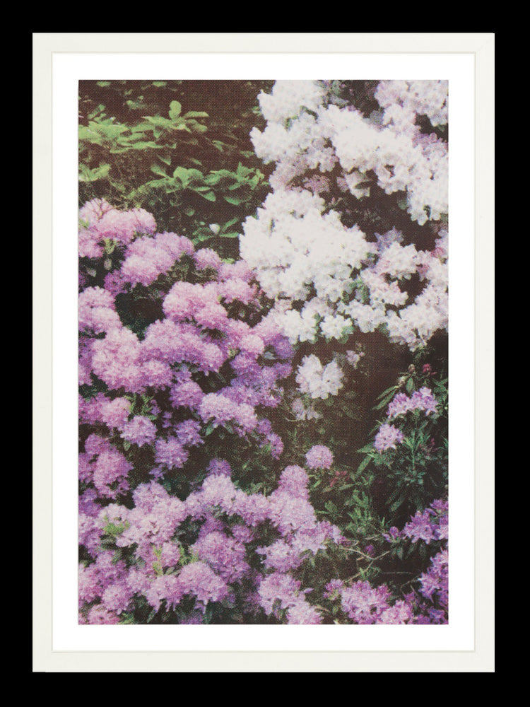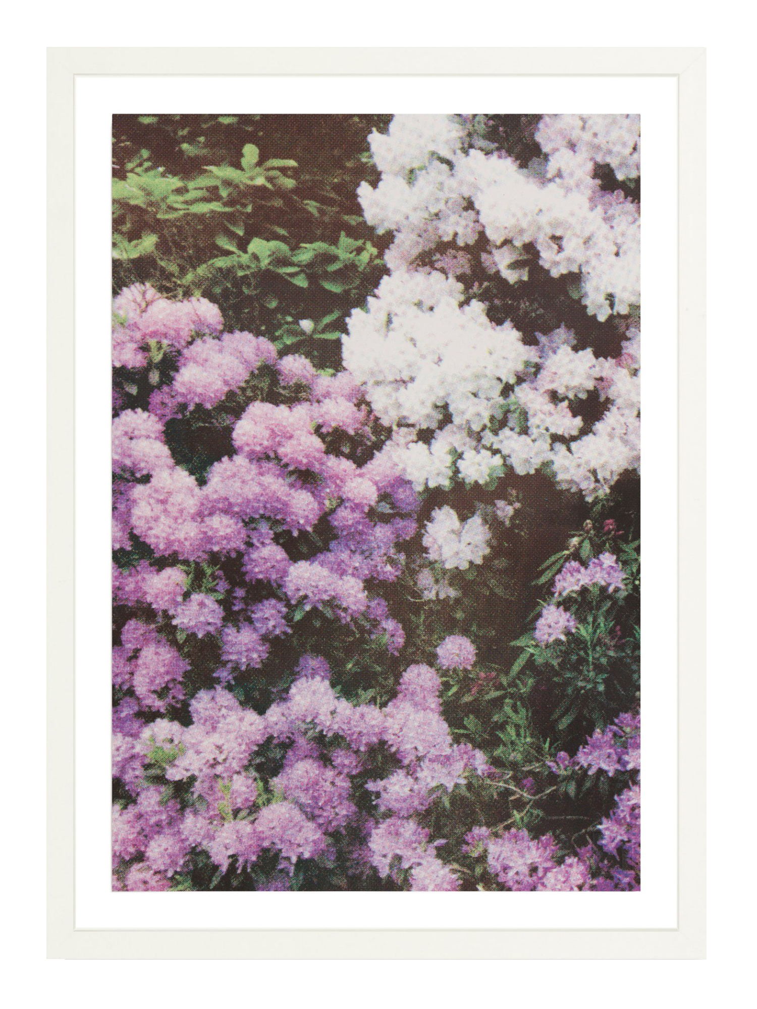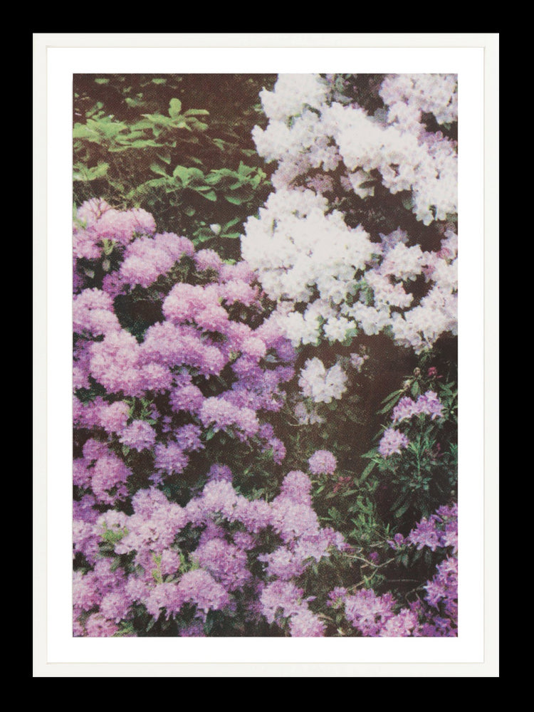 This series deconstructs the perspectival “lattice” developed during the 15th and 16th centuries as a tool for organizing and rendering three-dimensional spaces as two-dimensional “landscapes”. The lattice motif in this series disrupts rather than organizes the garden view and the flatness inherent to the screenprinting process negates any attempts at spatial perspective. Additionally, the grid has shifted from its pictorial structure of the Renaissance to form the dotted armature for color image reproduction, with specifically angled “ben day” dots fanning out across the page to generate each photo-based colored print.